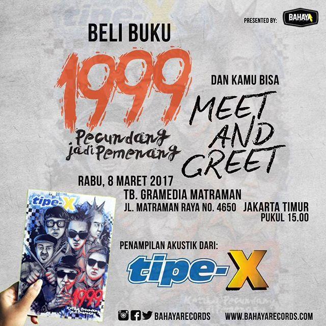 Bagi kalian xfriends &xangels yang belum memiliki buku 1999, segera dapatkan buku 1999 di TB. Gramedia Matraman hari Rabu, 8 Maret 2017 jam 3 sore. @tipexofficial akan perform akustik, meet and greet, serta book signing HTM: 80.000 (sudah dapat buku) Kami tunggu! #SalamX